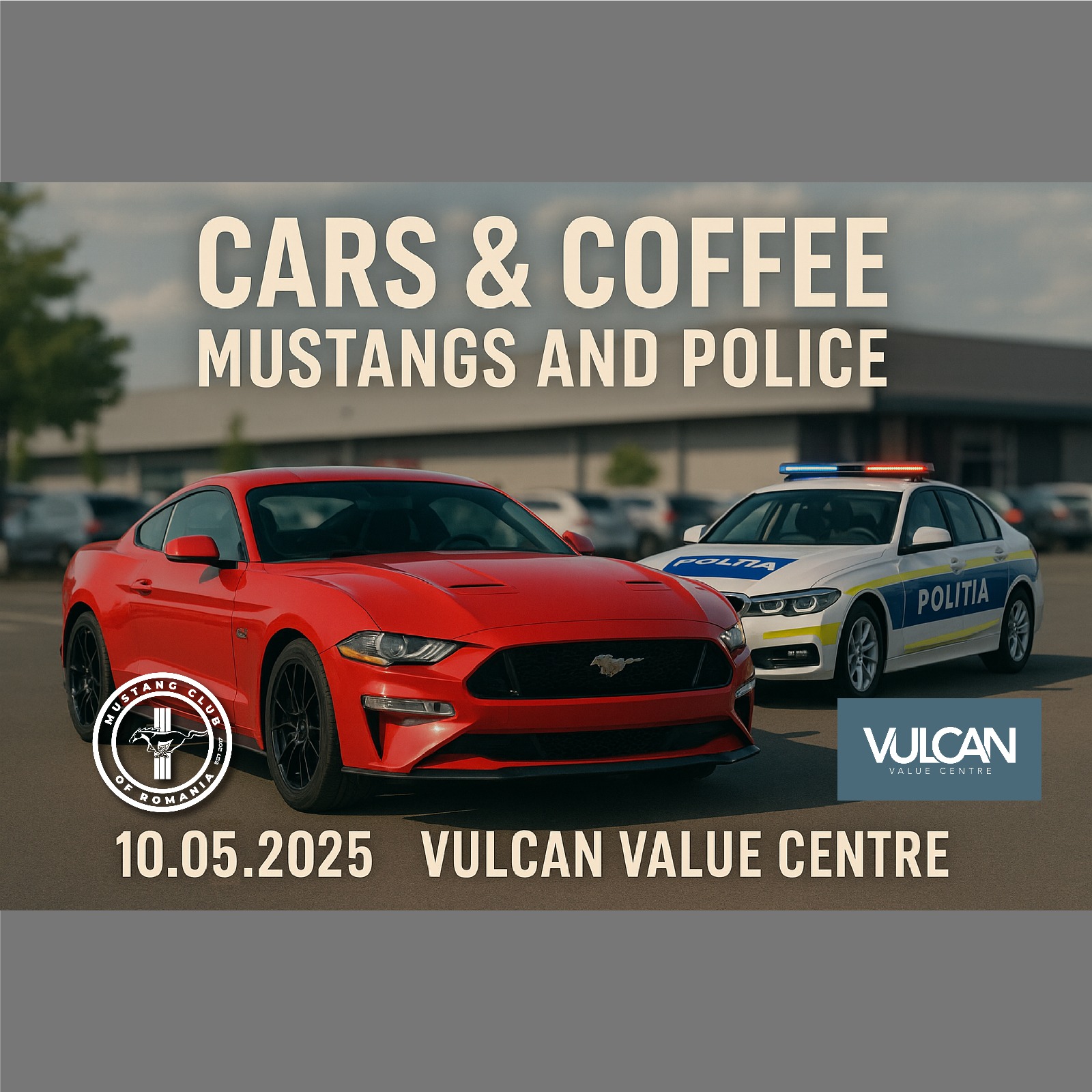 Pe 10 mai 2025, între orele 11:00 și 14:00, parcarea Vulcan Value Centre din București devine punctul de întâlnire pentru pasionații de mașini și susținătorii siguranței rutiere, în cadrul evenimentului tematic „Cars & Coffee – Mustangs and Police”.