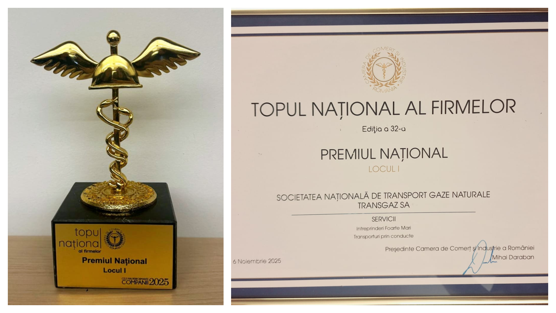 Societatea Națională de Transport Gaze Naturale TRANSGAZ S.A., operatorul tehnic al Sistemului Național de Transport (SNT) gaze naturale, a fost distinsă cu Premiul Național – Locul I în cadrul Topului Național al Firmelor 2025, ediția a XXXII-a, organizată de Camera de Comerț și Industrie a României (CCIR), la secțiunea Servicii/Întreprinderi Foarte Mari/Transportul prin conducte. Oficialii companiei au transmis: “Această recunoaștere prestigioasă confirmă încă o dată performanța, soliditatea și contribuția strategică a TRANSGAZ la dezvoltarea sectorului energetic național și regional. Premiul reflectă profesionalismul, eficacitatea și angajamentul companiei față de excelență, sustenabilitate și performanță în transportul gazelor naturale.