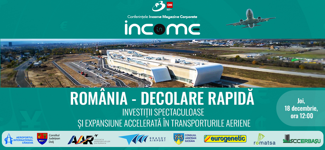 Conferința națională Income Magazine Corporate „România – Decolare rapidă. Investiții spectaculoase și expansiune accelerată în transporturile aeriene” va avea loc joi, 18 decembrie 2025, începând cu ora 12:00, la Aeroportul Internațional “George Constantinescu” din Craiova, județul Dolj și va fi moderată de Adrian Ursu, jurnalist Antena 3 CNN.