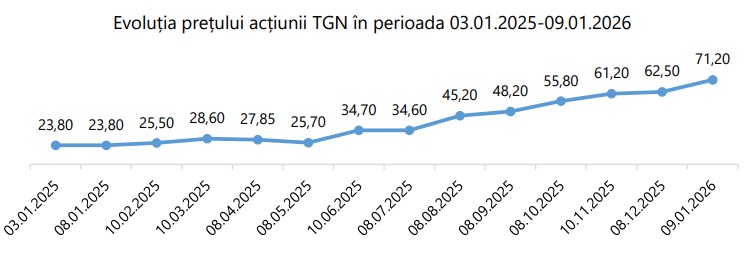 În perioada 3 ianuarie 2025 – 9 ianuarie 2026, acțiunea Transgaz (TGN) a înregistrat una dintre cele mai puternice evoluții de pe piața de capital, cu o apreciere de aproximativ 200%, care a condus la triplarea valorii acțiunii. În această perioadă prețul de închidere a crescut de la 23,80 lei la începutul anului 2025, la 71,20 lei în data de 9 ianuarie 2026, reflectând un interes susținut din partea investitorilor și o încredere solidă în perspectivele de dezvoltare ale companiei.
