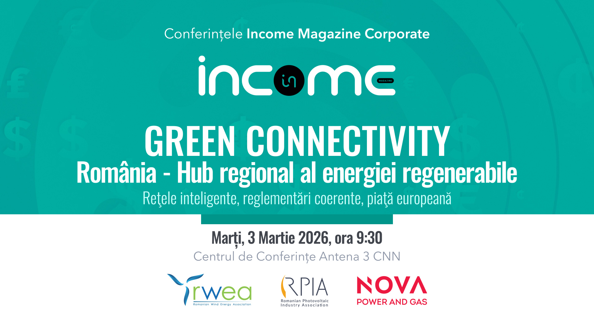 Tranziția energetică a României intră într-o nouă etapă de dezbatere strategică odată cu organizarea conferinței naționale Income Corporate „Green Connectivity / România – Hub regional al energiei regenerabile: rețele inteligente, reglementări coerente și piață europeană”, de marți, 3 martie 2026, ora 9:30, la Centrul de Conferințe Antena 3 CNN – THE MARK, Clădirea Turn (Calea Griviței nr. 84–98, etaj 2), București.