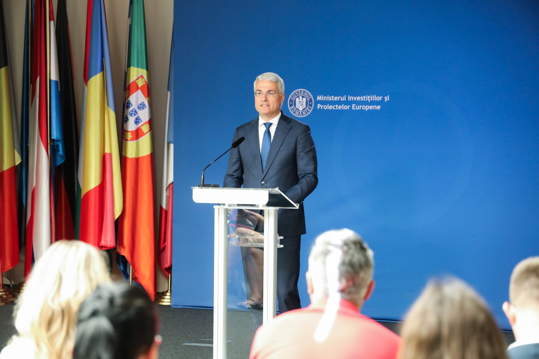 ‘Confort datelor la zi, furnizate de Comisia Europeană, România este, în acest moment, peste media Uniunii Europene de 11,4%. România este astăzi la 16,3%. Avem și noi propria noastră raportare, care ia în calcul diversele etape, de la sumele absorbite efectiv ca viramente către România, până la sumele care sunt contractate și trimise apoi către plată, dar ceea ce este important e că am luat ca referință sumele raportate la nivel european de 16,3%. Este a doua cea mai mare sumă în termeni absoluți pe care România o are: 5,64 miliarde de euro și avem peste 5.800 de proiecte în implementare în acest moment. Prin urmare, față de anul trecut, când eram la sub 5%, există o accelerare și în mandatul pe care îl avem în Ministerul Investiției și Proiectelor Europene, accelerarea continuă’, a spus ministrul.