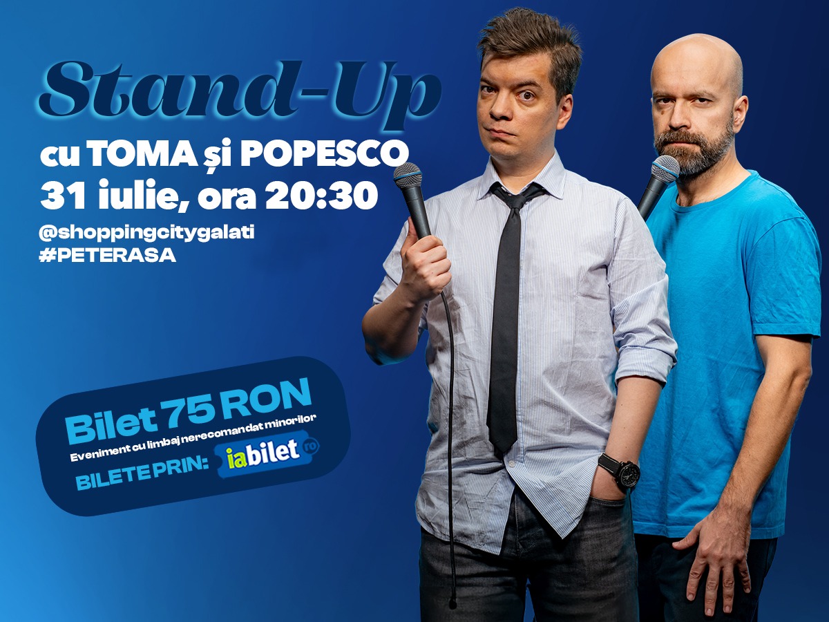 Finalul lunii iulie aduce un show de stand-up plin de umor la #peterasă. Toma și Popesco vor urca pe scena Shopping City Galați, într-un spectacol ce promite să aducă zâmbete largi în seara de 31 iulie, începând cu ora 20:30. Biletele pot fi achiziționate de pe iabilet.ro sau direct din locația evenimentului.