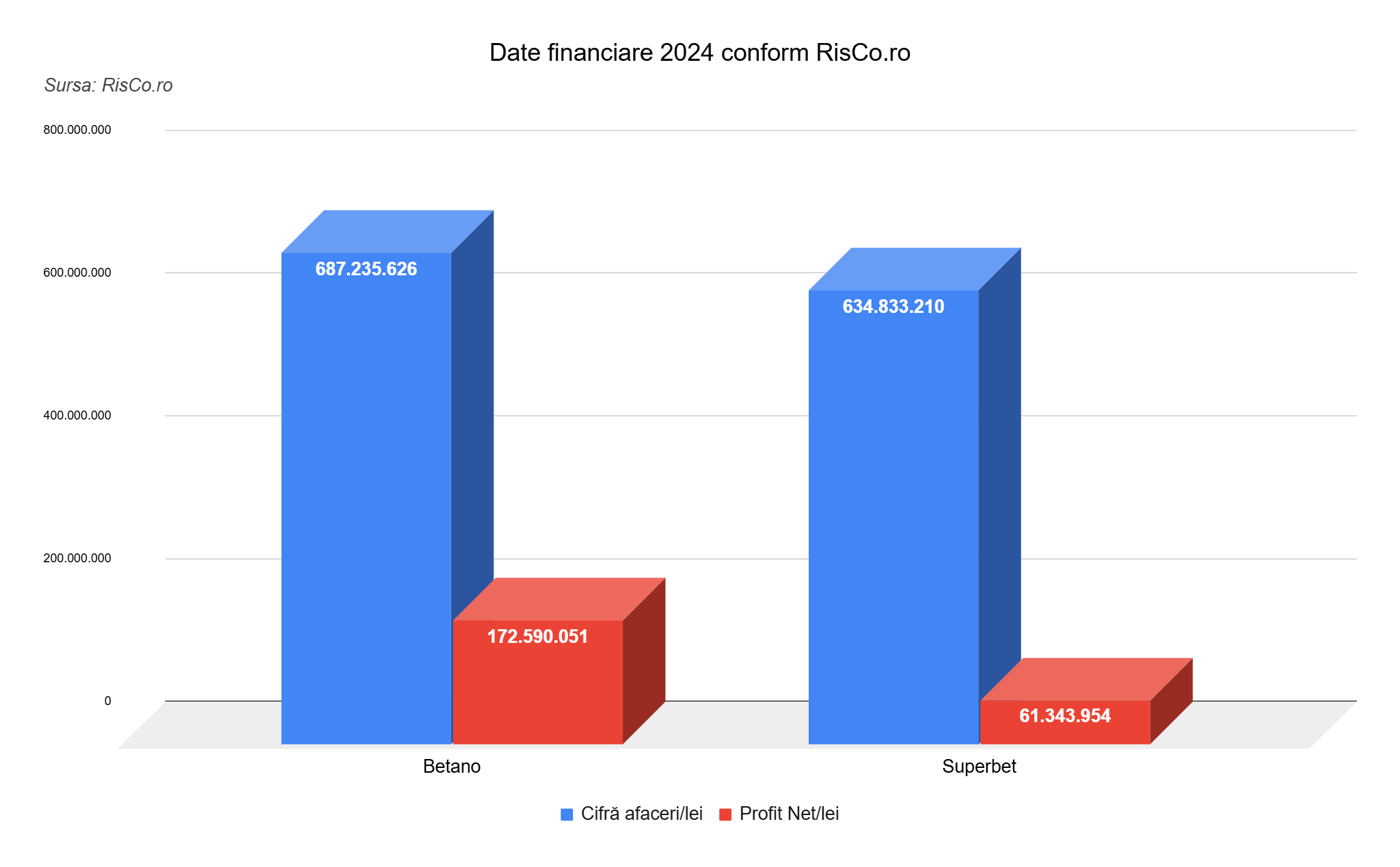 Astfel, conform raportărilor financiare pentru anul 2024, Betano a ajuns la o cifră de afaceri de 687 mil. lei și 172 mil. profit, iar Superbet la o cifră de afaceri de 634 mil. lei și profit de 61 mil. lei.