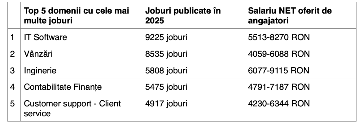 În 2025, analiza salariilor nete de pe Hipo.ro arată 5 domenii unde angajatorii au recrutat intens, comunicând intervale salariale clare. IT Software rămâne motorul principal al angajărilor, cu 9225 de joburi publicate și salarii nete cuprinse între 5.513 și 8.270 de lei, ceea ce reflectă competiția puternică pentru specialiști cu competențe digitale avansate.